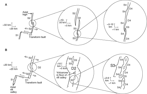 | A hierarchy of ridge segmentation defined by axial discontinuities for (A) fast- and (B) slow-spreading ridges. S1, 2, 3, 4 are ridge segments of order 1, 2, 3, 4 and D1, 2, 3, 4 are ridge axis discontinuities of order 1, 2, 3, 4. At both fast- and slow-spreading centers, first-order discontinuities are transform faults. Examples of second-order discontinuities are overlapping spreading centers (OSCs) on fast-spreading ridges and oblique shear zones on slow-spreading ridges. Third-order discontinuities are small OSCs on fast-spreading ridges and inter-volcano gaps on slow-spreading ridges. Fourth-order discontinuities are deviations from axial linearity (devals) resulting in slight bends or lateral offsets of the axis of less than 1 km on fast-spreading ridges and are intra-volcano gaps on slow-spreading ridges. This four-tiered hierarchy of segmentation may really be a continuum. It has been established, for example, that fourth-order segments and discontinuities can grow to become third-, second-, and even first-order discontinuities and vice versa at both slow- and fast-spreading centers. |